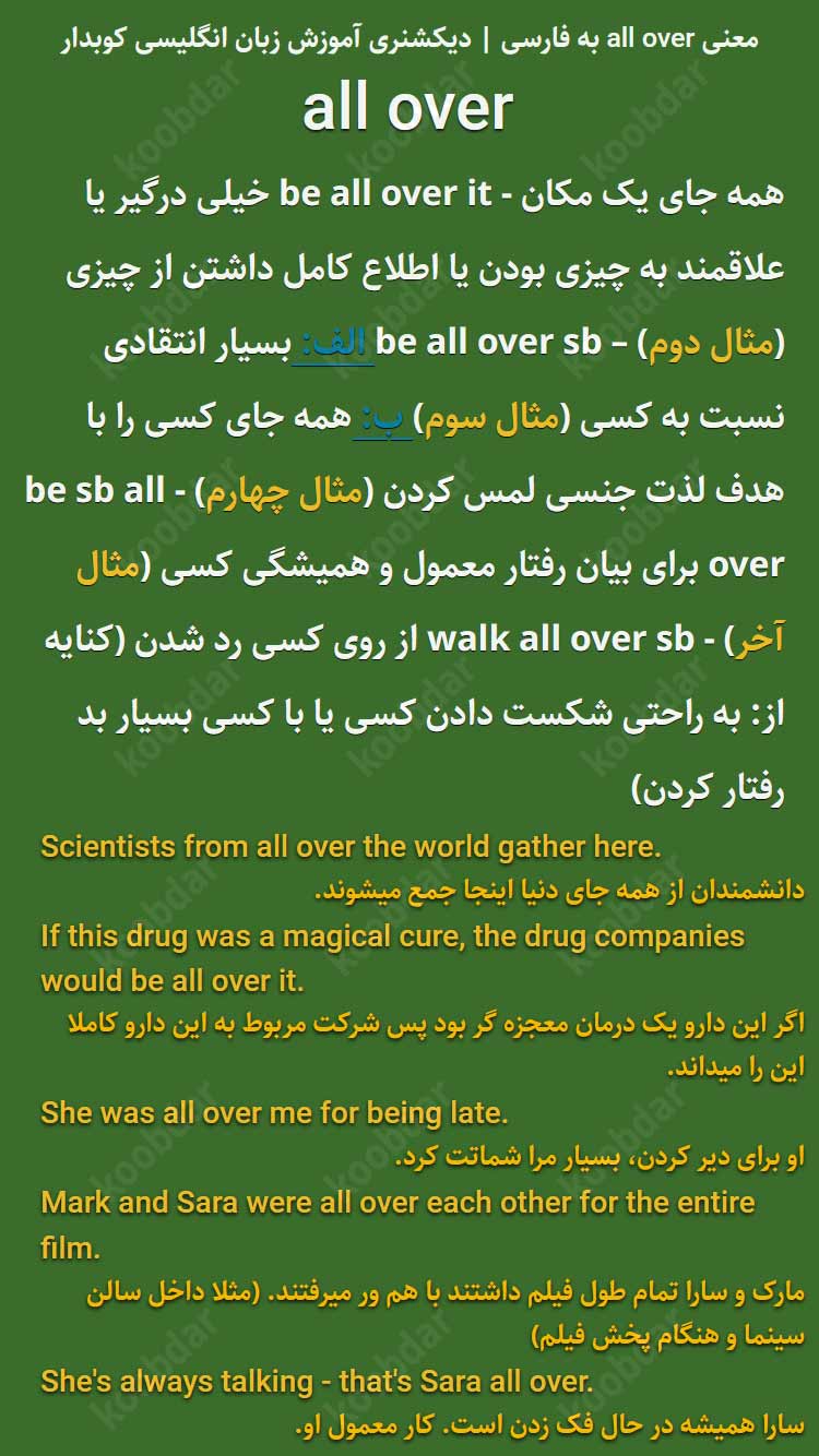 همه جای یک مکان - be all over it خیلی درگیر یا علاقمند به چیزی بودن یا اطلاع کامل داشتن از چیزی (مثال دوم) – be all over sb الف: بسیار انتقادی نسبت به کسی (مثال سوم) ب: همه جای کسی را با هدف لذت جنسی لمس کردن (مثال چهارم) - be sb all over برای بیان رفتار معمول و همیشگی کسی (مثال آخر) - walk all over sb از روی کسی رد شدن (کنایه از: به راحتی شکست دادن کسی یا با کسی بسیار بد رفتار کردن)