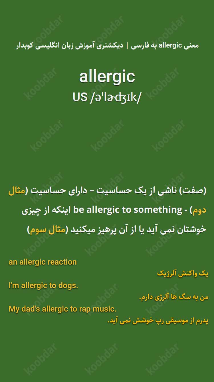 (صفت) ناشی از یک حساسیت – دارای حساسیت (مثال دوم) - be allergic to something اینکه از چیزی خوشتان نمی آید یا از آن پرهیز میکنید (مثال سوم)