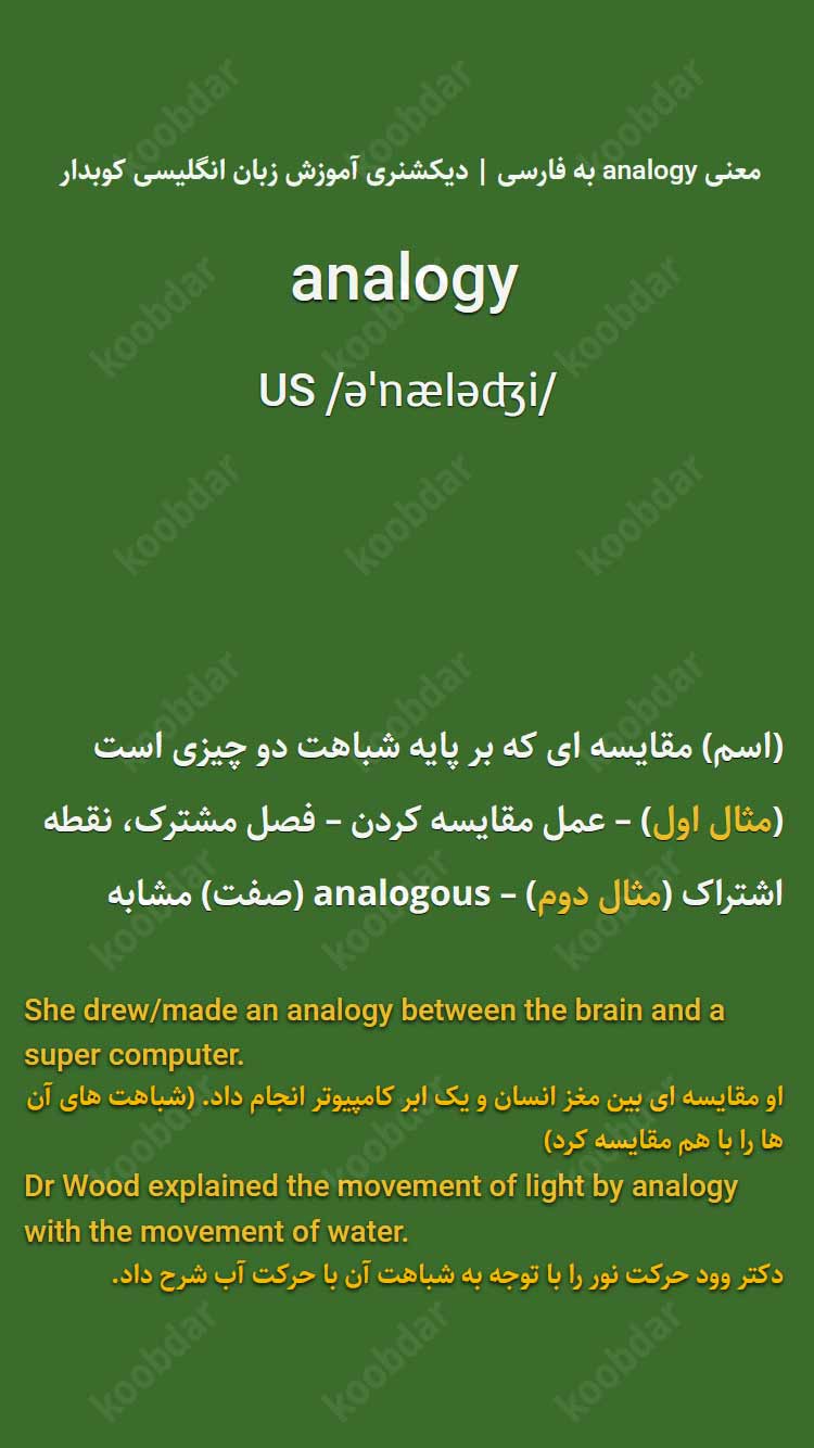 (اسم) مقایسه ای که بر پایه شباهت دو چیزی است (مثال اول) – عمل مقایسه کردن – فصل مشترک، نقطه اشتراک (مثال دوم) – analogous (صفت) مشابه